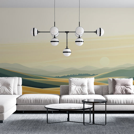 WonderMuralDit foto behang biedt een delicate weergave van golvende weiden, waar gouden velden samensmelten met groene heuvels onder een rustgevende hemel. De...