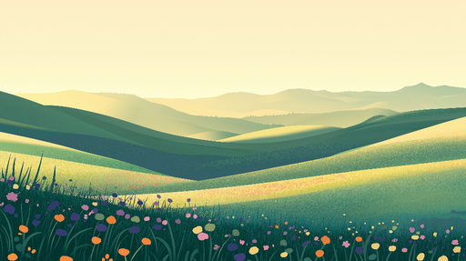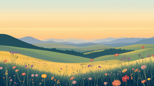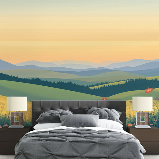 WonderMuralDit foto behang roept een boeiend prairielandschap op waar de groene heuvels overgaan in een pastelkleurige lucht bij zonsondergang. Kleurrijke blo...