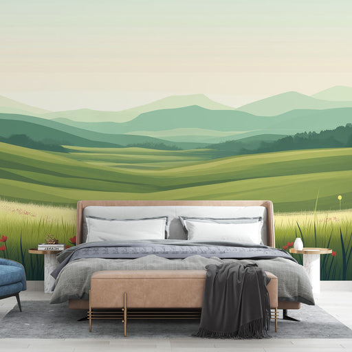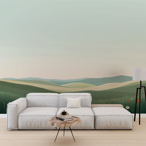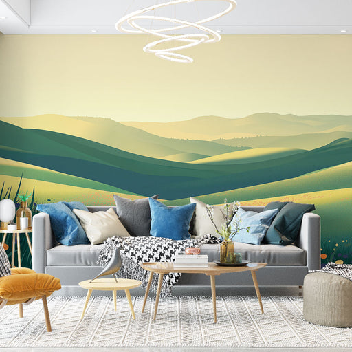 WonderMuralOntdek ons foto behang geïnspireerd door weiden, dat een uitgestrekt landschap van zachte heuvels toont, bedekt met rustgevend groen en bezaaid met...
