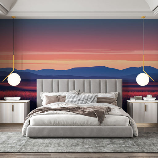 WonderMuralDit foto behang toont een magnifiek weidelandschap bij zonsondergang, waarbij tinten van paars en roze harmonieus samenvloeien. De uitgestrekte wei...