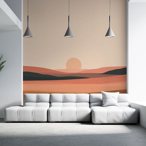 WonderMuralDit foto behang roept een moderne prairie op, badend in gouden lichten, en vertegenwoordigt een kalm landschap onder een rustgevende zonsondergang....