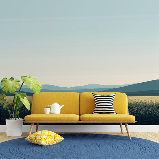 WonderMuralOns Foto Behang roept een prachtig landschap op van gouden weide onder een heldere blauwe lucht, versierd met silhouetten van bergen in de verte. D...