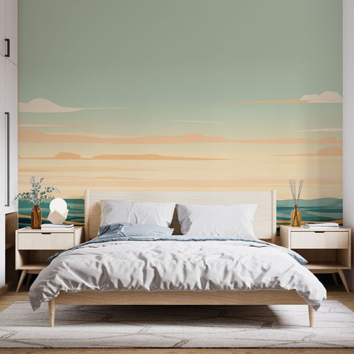 WonderMuralDit foto behang illustreert een prachtig prairielandschap met glooiende heuvels en een delicate lucht. De tinten groen, geel en blauw vloeien samen...