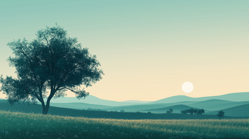 WonderMuralDit foto behang roept een serene weide op, waar een grote boom staat onder een zachte lucht met pastelkleuren. Het panoramische uitzicht op de heuv...