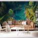 Deze fotobehang toont een luchtfoto van een rustgevend natuurlijk landschap, waar een kristalheldere rivier door weelderig groen kronkelt. De blauwe tinten van het water, evenals de texturen van de rotsen en bomen, creëren een serene sfeer die ideaal is om een gevoel van ontsnapping naar je ruimte te brengen.