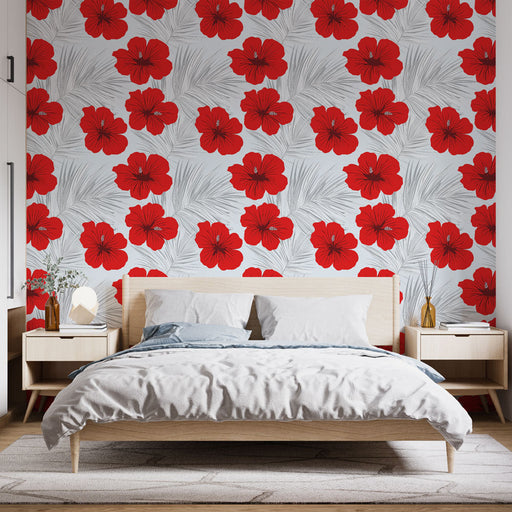 WonderMuralOnze prachtige behang heeft een levendig patroon van rode hibiscusbloemen omringd door delicate grijze bladeren, waardoor een tropische en feesteli...