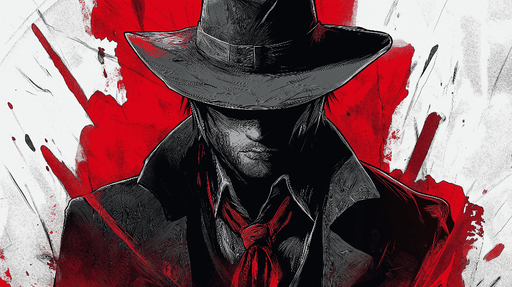 WonderMuralDeze betoverende Foto Behang toont een mysterieuze silhouet van een donkere figuur, gekleed in een lange jas en hoed, omringd door spetters van lev...