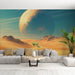 Ontdek ons boeiende foto behang met een woestijnlandschap met gouden zandduinen onder een rustgevende azuurblauwe lucht. De majestueuze planeet op de achtergrond, met unieke tinten en patronen, voegt een vleugje ontsnapping en verbeelding toe aan je interieur.