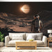 Dit boeiende foto behang toont een astronaut die op een maanlandschap staat, met de majestueuze planeet Jupiter op de achtergrond, verlicht door een zacht licht. De details van het landschap, met zijn golvende bergen en realistische textuur, voegen diepte en dimensie toe aan de ruimte, en roepen een sfeer van verkenning en ontdekking op.