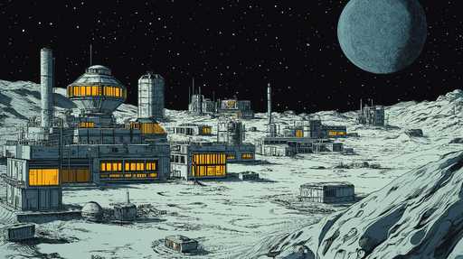 WonderMuralDit boeiende foto behang toont een uitzicht op een futuristische maanbasis, met moderne structuren en gouden verlichting die opvallen tegen een ser...
