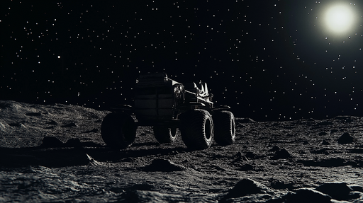 WonderMuralOntdek ons boeiende foto behang met daarop een verkenningsvaartuig dat over het maanoppervlak navigeert, badend in een mystiek diepe sterrenhemel. ...