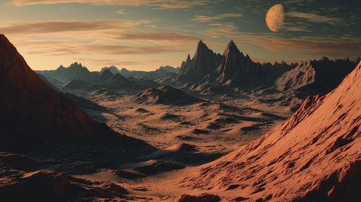 WonderMuralDit boeiende foto behang toont een spectaculair woestijnlandschap met torenhoge bergen die baden in zacht licht. Een immense maan valt op in de luc...
