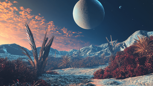 Alle gegevens bekijkenFoto Behang universum | Buitenaards landschap met twee manen en een gloeiende lucht