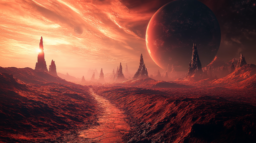 WonderMuralDit boeiende foto behang toont een fantasie-universum landschap, waar steile bergen oprijzen uit een roodachtige grond onder een brandende hemel. D...