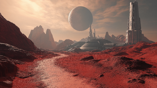 Alle gegevens bekijkenFoto Behang universum | Marslandschap met futuristische structuren
