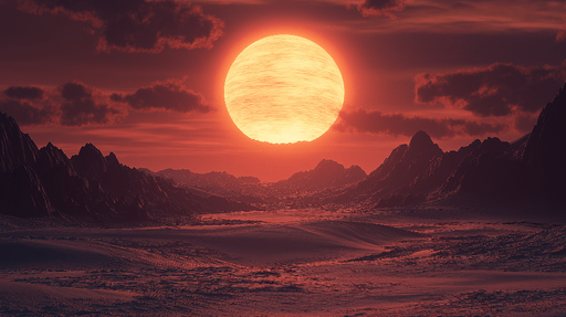 Alle gegevens bekijkenFoto Behang universum | Buitenaards landschap met een grote ster en surrealistische bergen