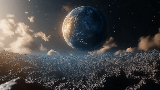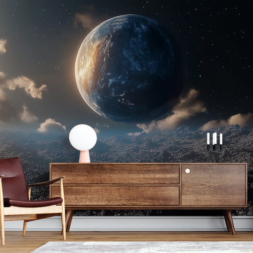 WonderMuralOns foto behang bevat een boeiend kosmisch tafereel waar een majestueuze planeet boven een intrigerend terrestrisch landschap zweeft. De tinten bla...