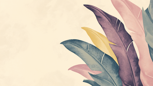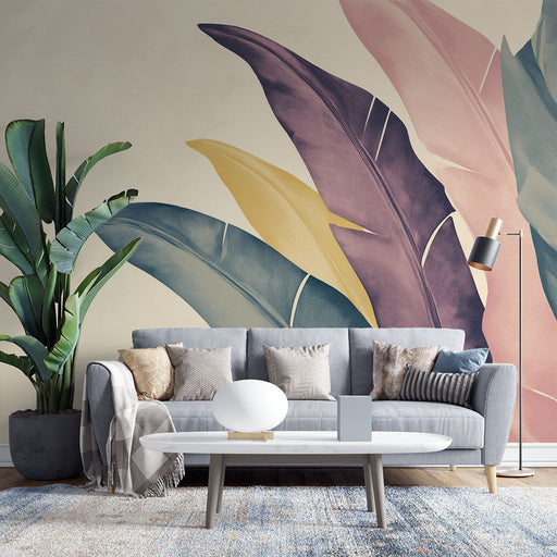 WonderMuralOntdek ons foto behang dat prachtige gestileerde bladeren benadrukt in een palet van zachte en moderne kleuren. De tinten roze, geel, paars en blau...