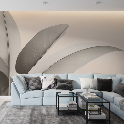 WonderMuralDit foto behang heeft een elegant ontwerp van gestileerde bladeren in grijstinten op een zachte beige achtergrond. De combinatie van neutrale tinte...