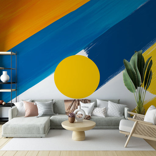 WonderMuralDeze foto behang heeft een gedurfd ontwerp met kleurrijke geometrische vormen, waaronder gele, rode en witte cirkels, die contrasteren tegen een zw...