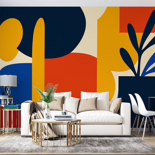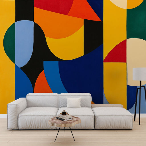 WonderMuralDeze fascinerende fotobehang heeft een abstract ontwerp bestaande uit dynamische geometrische vormen in levendige tinten rood, geel en blauw, geacc...