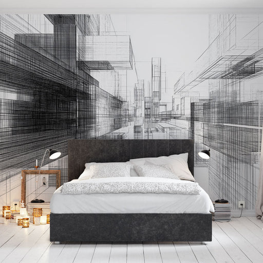 WonderMuralDeze foto behang heeft een fascinerend abstract ontwerp met zwart-witte geometrische lijnen en vormen die een illusie van diepte creëren. De fijne ...