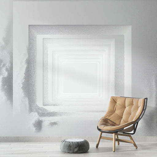 WonderMuralDeze minimalistische foto behang heeft een boeiend geometrisch patroon, dat een reeks frames in perspectief oproept op een heldere witte achtergron...