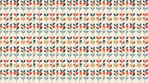 WonderMuralOnze prachtige foto behang heeft een patroon van gestileerde takken met bladeren en bessen in levendige kleuren. De tinten rood, blauw en geel op e...