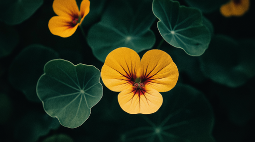 WonderMuralDeze foto behang benadrukt een gele Oost-Indische kers bloem, stralend in schoonheid, omringd door grote groene bladeren. Het contrast tussen de he...