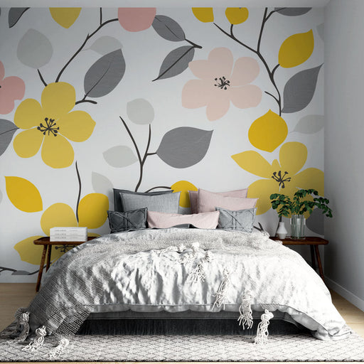 WonderMuralDeze speelse Foto Behang heeft een prachtig patroon van heldergele bloemen, omringd door delicate grijze bladeren, perfect gerangschikt op een lich...
