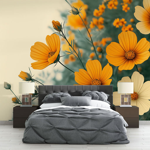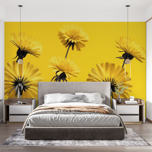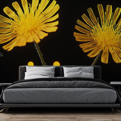 WonderMuralDeze foto behang benadrukt een levendig bloemendesign met heldergele bloemen op een donkere achtergrond, waardoor een opvallend en dynamisch visuee...
