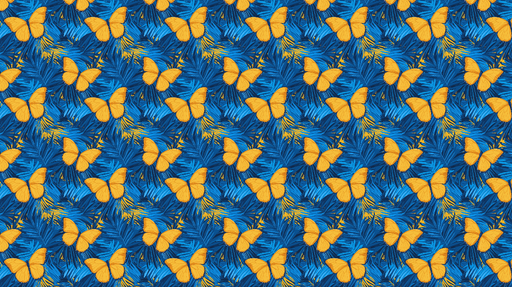 Alle gegevens bekijkenFoto Behang vlinders | Geel vlinderpatroon op een blauwe bladerenachtergrond