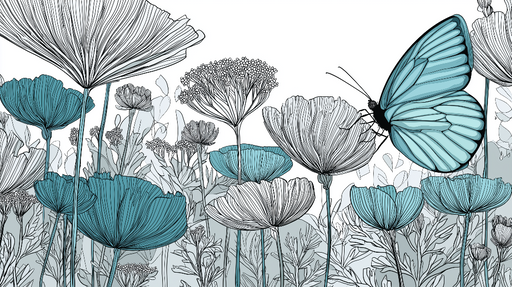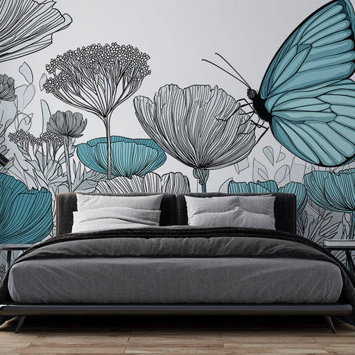 WonderMuralDeze prachtige foto behang heeft een uniek ontwerp met delicate bloemen met fijne contouren en een pastelblauwe vlinder die een vleugje leven breng...