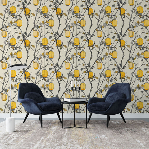 WonderMuralDeze behang benadrukt een charmant motief van takken versierd met gele lantaarns, omringd door delicate bladeren, waardoor een sfeer ontstaat die z...