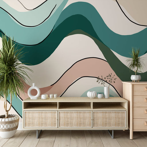WonderMuralDeze foto behang heeft een vloeiend ontwerp met elegante golven en harmonieuze pastelkleuren, variërend van groen tot roze en beige. De zwarte lijn...