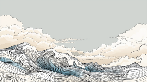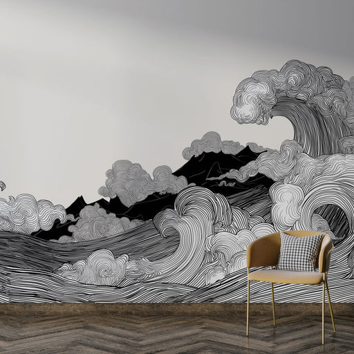 WonderMuralDeze behang biedt een fascinerend patroon van gestileerde golven en wolken, uitgevoerd in fijne en delicate lijnen die spelen met het contrast van ...