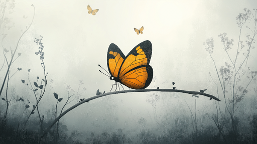 WonderMuralDeze betoverende foto behang toont een prachtig gestileerde oranje vlinder die delicaat landt op een tak, omringd door subtiele bloemmotieven en ee...