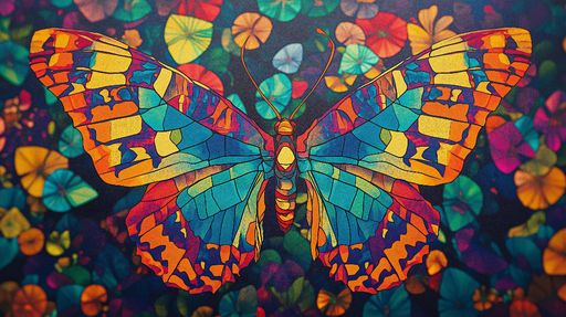WonderMuralDit fascinerende foto behang toont een gestileerde vlinder in felle kleuren, met opvallende geometrische patronen. De rijk gekleurde bloemenachterg...