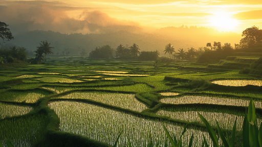 Alle gegevens bekijkenFoto Behang landschap van rijstvelden | Gouden gloed van zonsopgang over weelderige rijstvelden