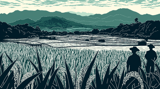 WonderMuralDeze foto behang biedt een boeiend panoramisch uitzicht op een landelijk landschap, met silhouetten van boeren die in een weelderig rijstveld staan...
