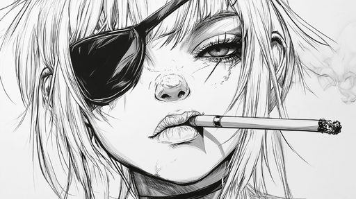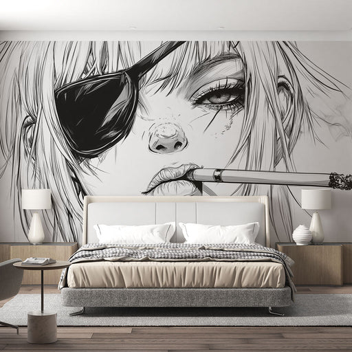 WonderMuralDeze fascinerende illustratie toont een vrouw met een piratenoog, die een aura van mysterie en kracht uitstraalt. Haar doordringende blik en gedurf...