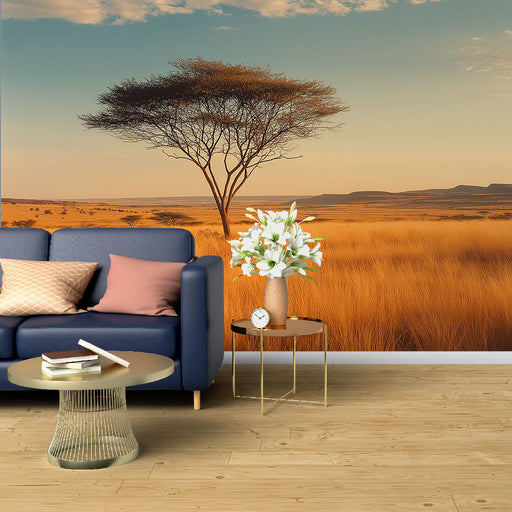 WonderMuralDit prachtige foto behang toont een serene savanne landschap, met een eenzame boom in het midden van een gouden veld. De warme tinten en gouden kle...