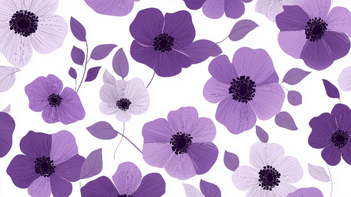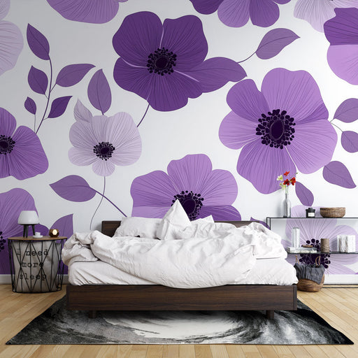 WonderMuralDeze florale foto behang heeft grote gestileerde bloemen in tinten paars en lavendel, tegen een helderwitte achtergrond. De fijn getekende bloembla...