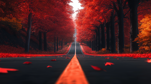 Deze foto behang roept een boeiend herfstlandschap op met een weg omringd door bomen met levendig rood blad. Elke blad dat zachtjes op het wegdek v...