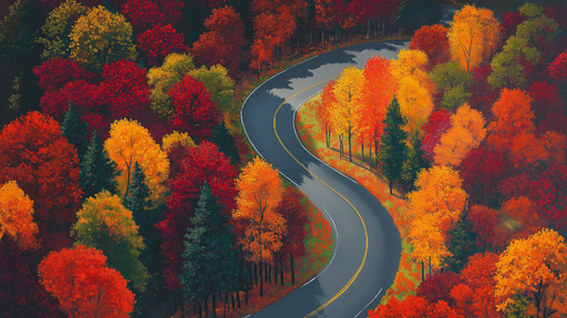 Deze opvallende foto behang illustreert een kronkelende weg die zich een weg baant door een landschap van herfstgekleurde bomen. De levendige tinte...