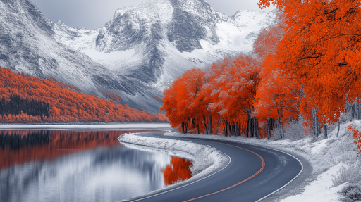 Deze fascinerende foto behang toont een herfsttafereel waar een kronkelende weg harmonieus opgaat in een spectaculair landschap. De bomen zijn vers...