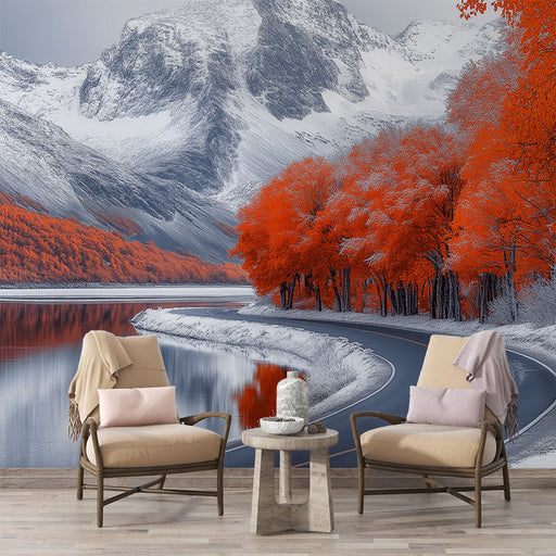 Dit foto behang roept een adembenemend winterlandschap op, waar een kronkelige weg door met sneeuw bedekte bergen slingert. De bomen in verschillen...