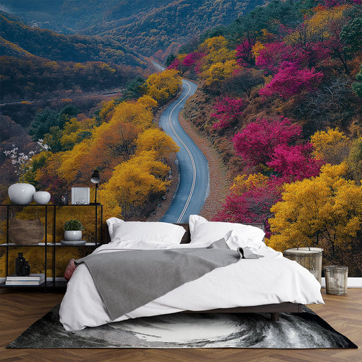 Dit foto behang roept een boeiend herfstlandschap op, waar een kronkelige weg een vallei doorkruist die gevuld is met bomen in schitterende kleuren...
