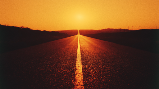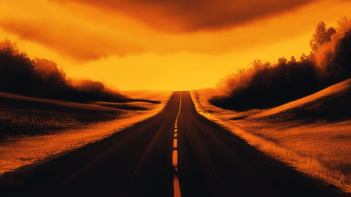 Onze originele foto behang toont een prachtige zonsondergang over een verlaten weg, omringd door heuvels in warme tinten oranje en geel. De majestu...