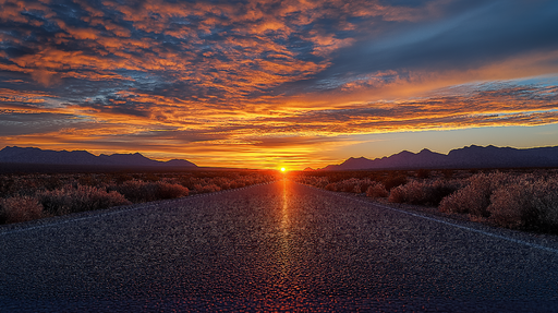 Dit foto behang roept een spectaculaire zonsondergang op, waar een eenzame weg zich uitstrekt tot aan de horizon, badend in warme tinten oranje en ...